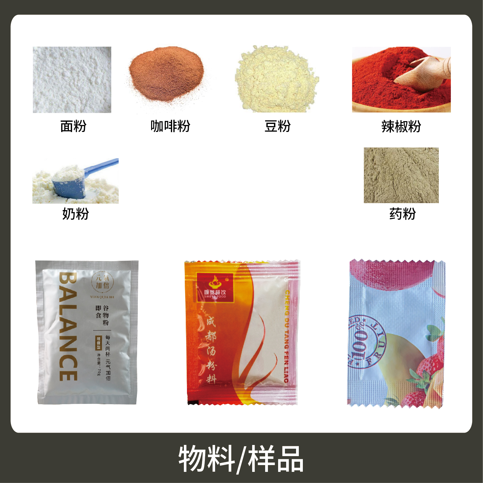 適用于食品、醫(yī)藥、化工、化妝品行業(yè)中粉劑物品的計(jì)量包裝,如:辣椒粉、咖啡粉、面粉等。