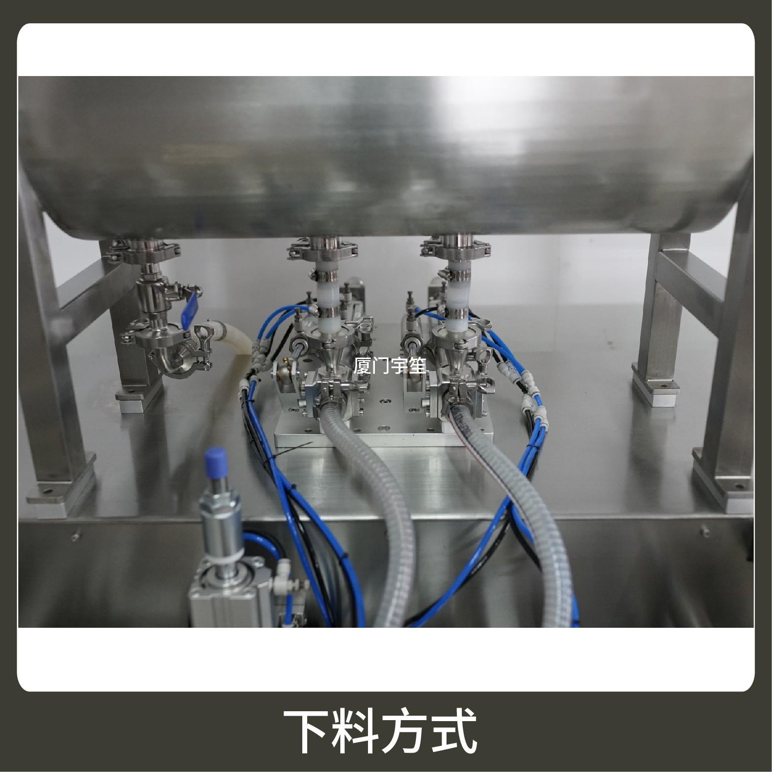 2、成品雙出,包裝流程全自動,無需人工操作??筛鶕?jù)充填物料的性質(zhì)選配不同的下料結構。